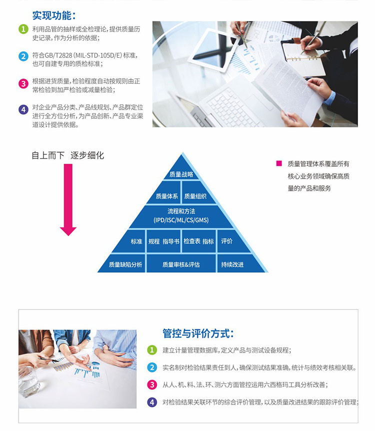 系统特色:实现测试结果自动采集,不良标签自动打印等,对进料检验、制造、验货等业务过程的质量监控,基于质量监控规则展开在线预警,同时支持质量改进过程跟踪管理。