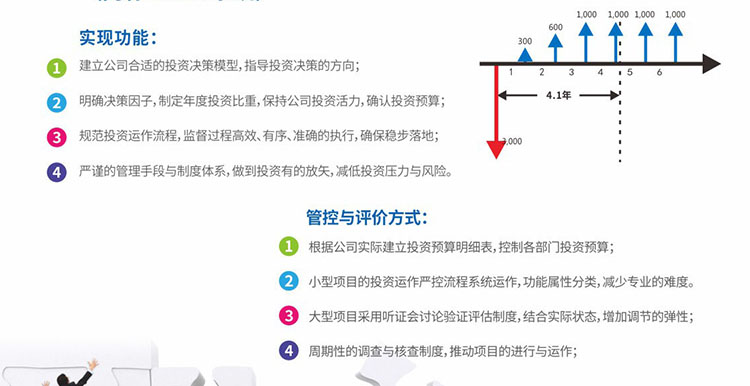 系统特色:规范投资管理的模型执行落实,实现与财务收益的一体化,严控投资的方向与效益,实现投资盈利。