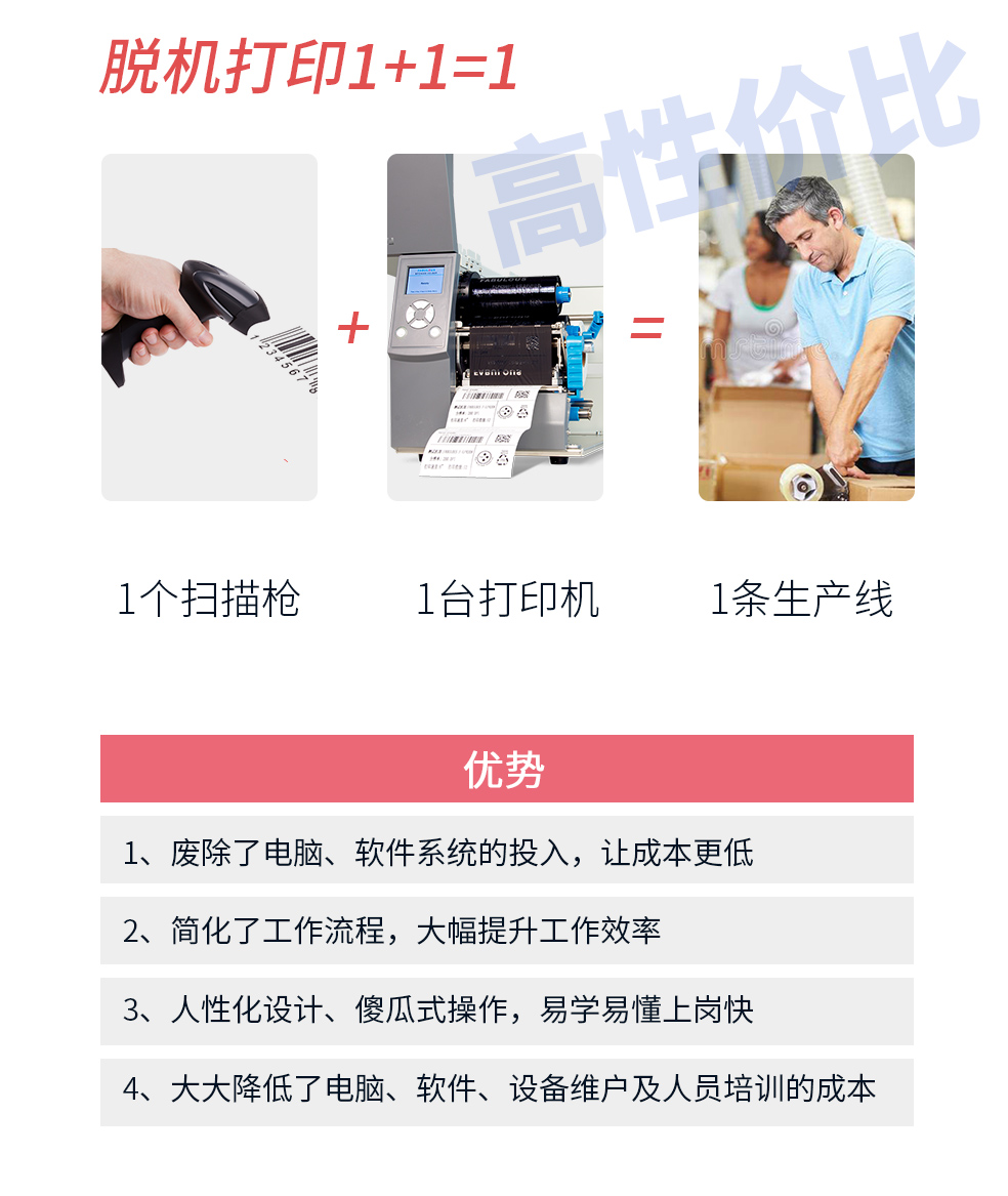 1.节省空间、低功耗。 2.外观紧凑美观,小巧轻便,可随时随地使用。 3.可独立工作,脱开电脑和软件的控制,编辑打印可在几秒内完成。 4.外部接口丰富,应用广泛。如:自动化流水线、手机制作行业、物流行业、应用终端行业、制衣行业等等。