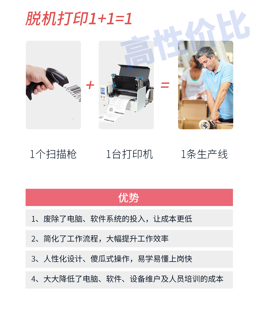 1.节省空间、低功耗。 2.外观紧凑美观,小巧轻便,可随时随地使用。 3.可独立工作,脱开电脑和软件的控制,编辑打印可在几秒内完成。 4.外部接口丰富,应用广泛。如:自动化流水线、手机制作行业、物流行业、应用终端行业、制衣行业等等。